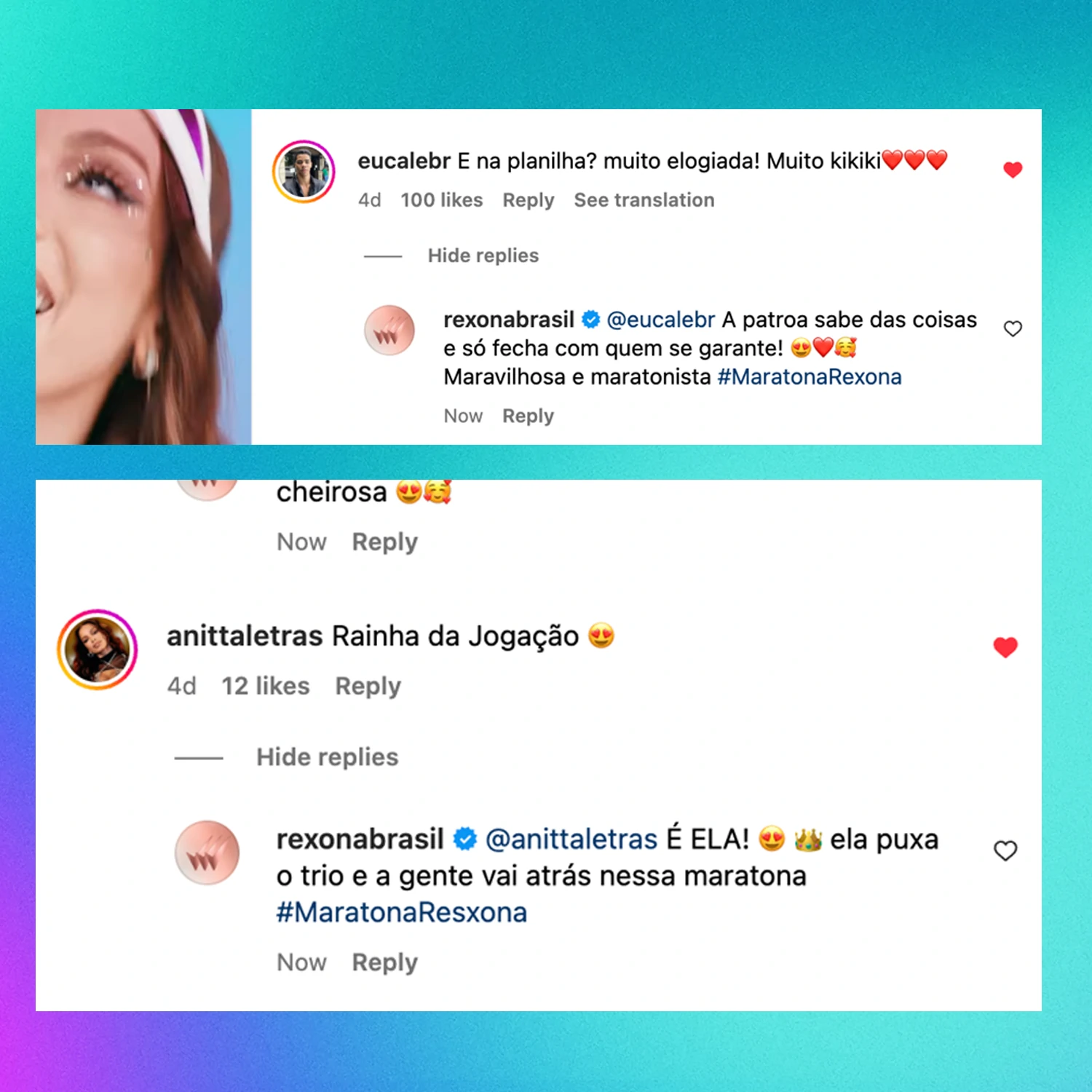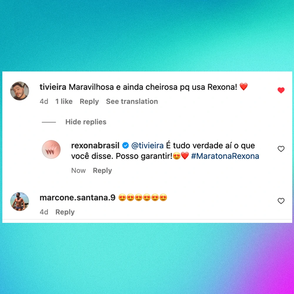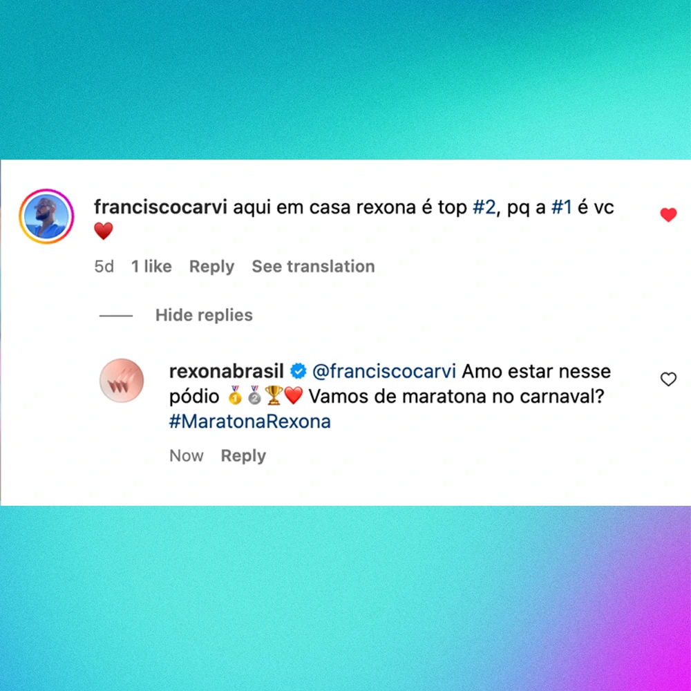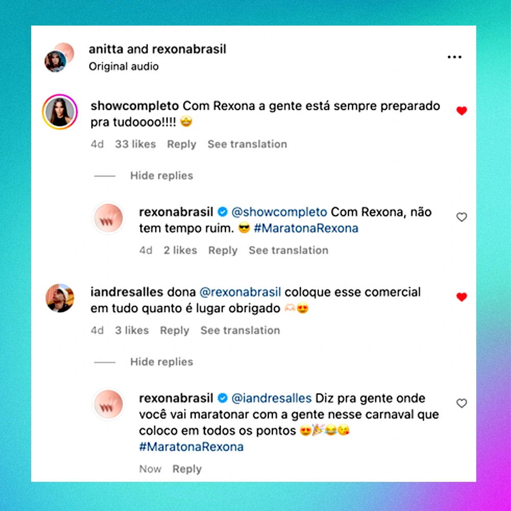 Como Community Manager na agência DM9, tive a oportunidade de colaborar com um dos momentos mais importantes do ano para a cliente (a marca Rexona) e ajudar a manter o tom de voz e consistência de mensagem de Rexona, não só respondendo e reagindo a comentários nas redes, mas gerando conversas e aproximando-se da comunidade de Rexona e do fandom do asset principal da campanha, a cantora Anitta.