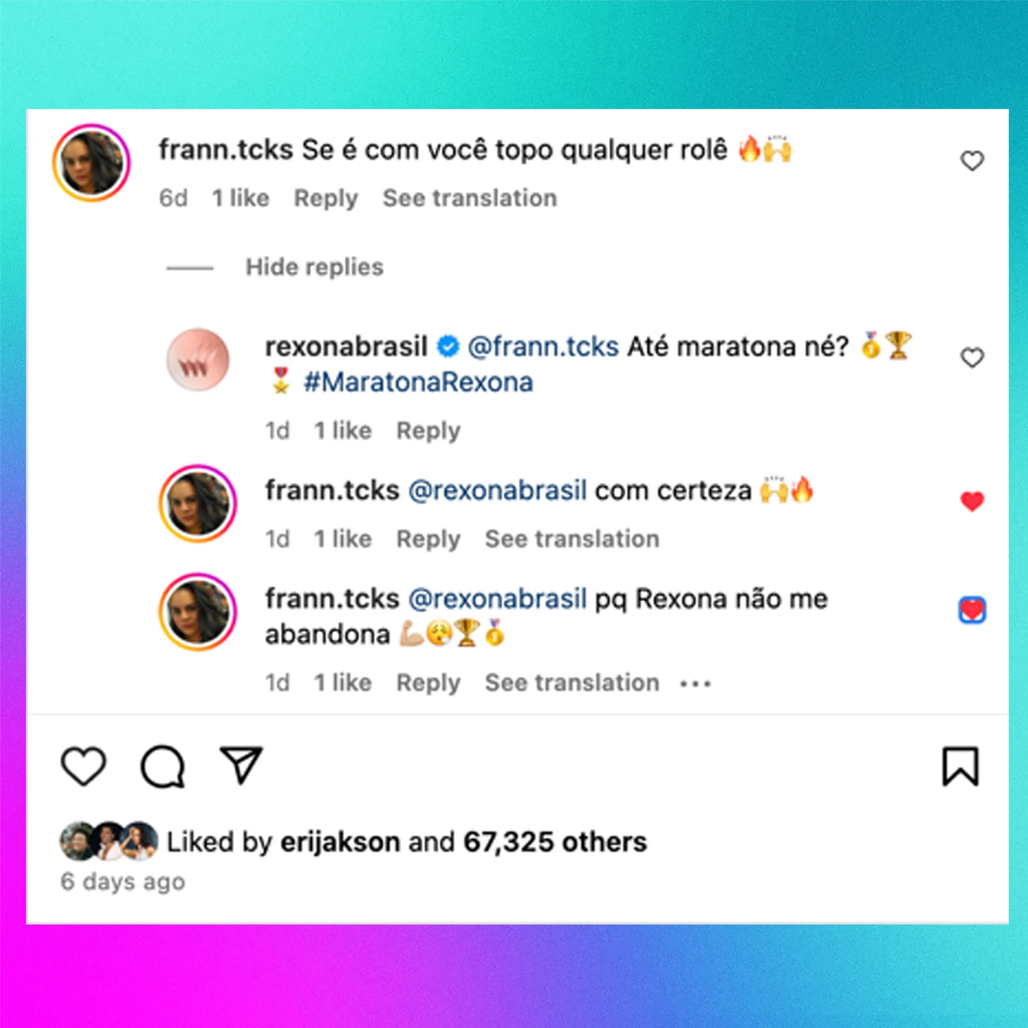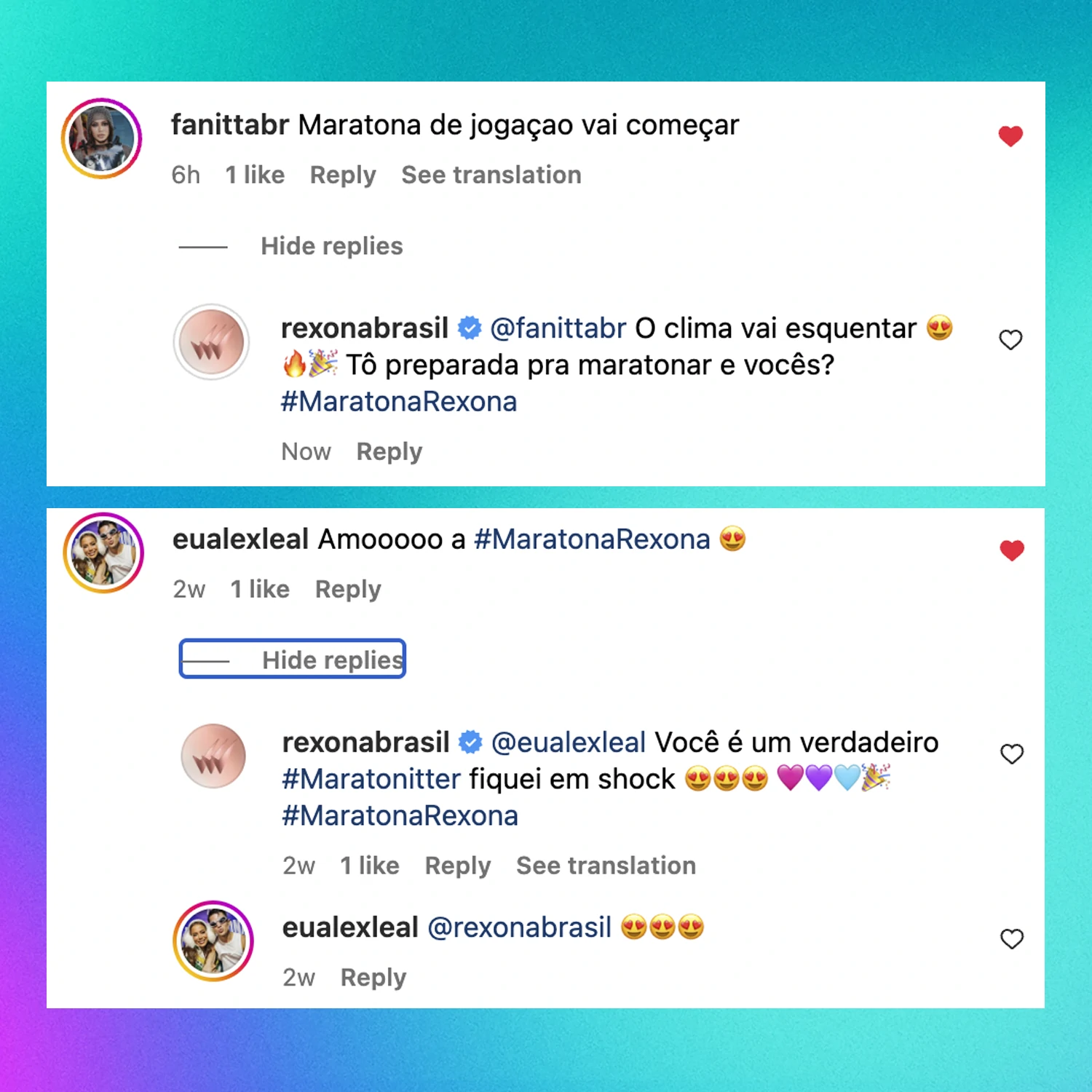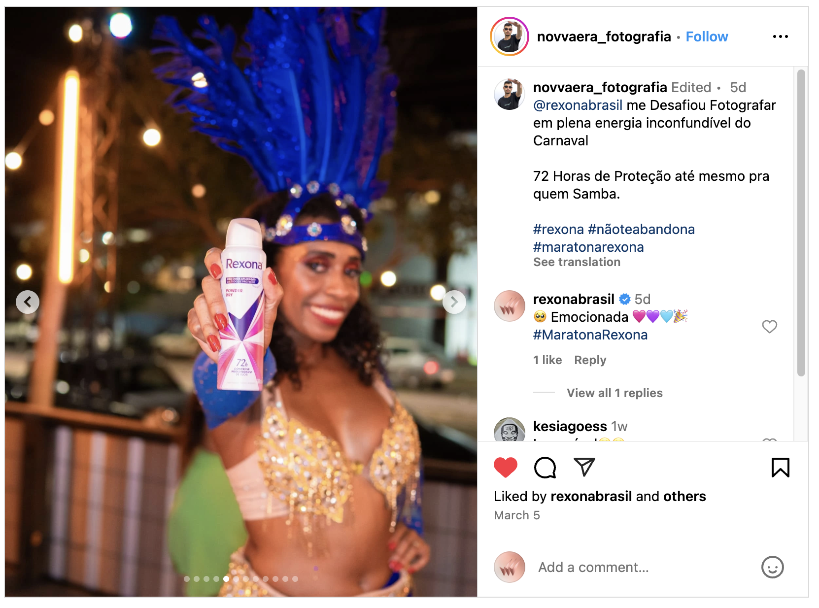 Como Community Manager na agência DM9, tive a oportunidade de colaborar com um dos momentos mais importantes do ano para a cliente (a marca Rexona) e ajudar a manter o tom de voz e consistência de mensagem de Rexona, não só respondendo e reagindo a comentários nas redes, mas gerando conversas e aproximando-se da comunidade de Rexona e do fandom do asset principal da campanha, a cantora Anitta.
